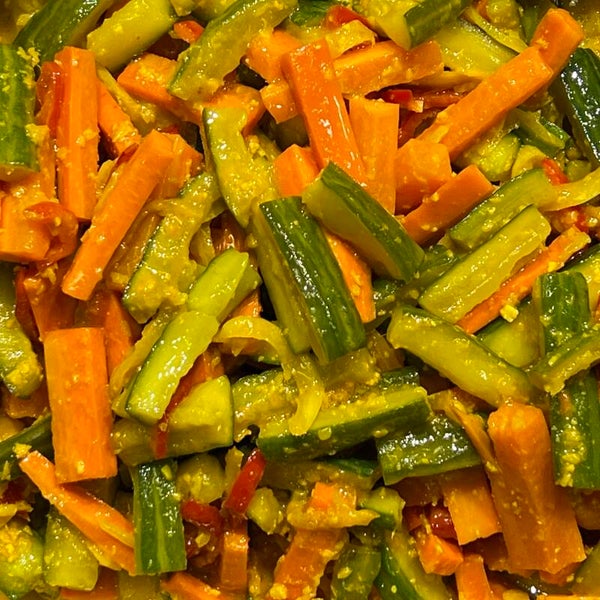Indonesisch bijgerecht. Wortel en komkommer in een zoet-zure saus. Lekker om koud te eten. De gele kleur komt van kunyit.
